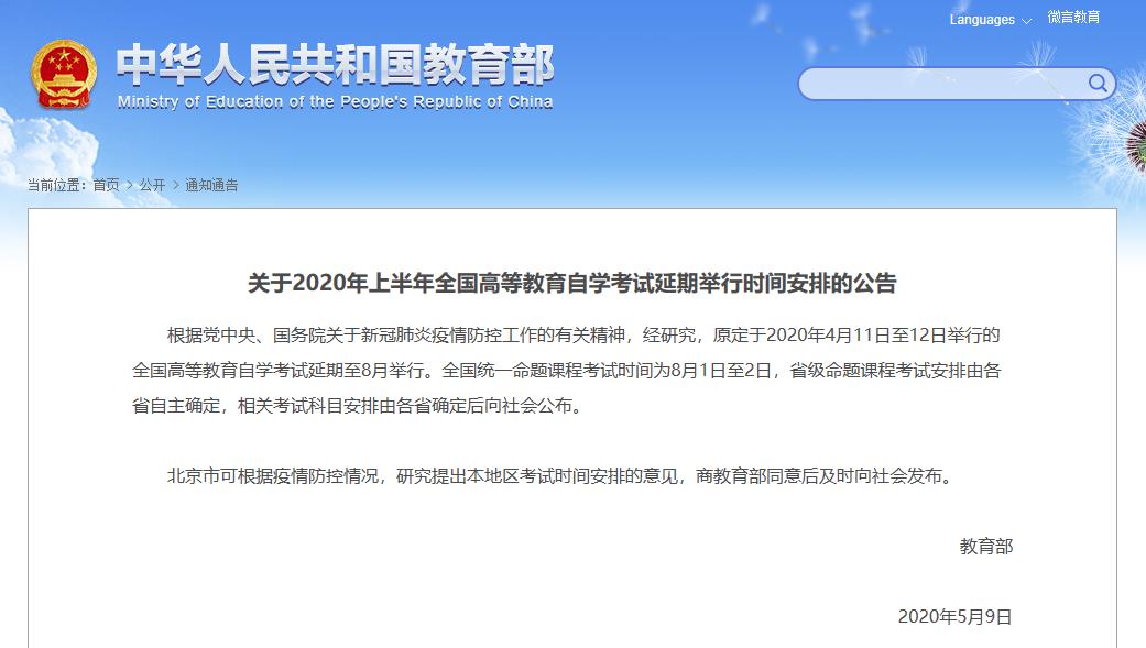 教育部:4月自考統(tǒng)考時(shí)間確定為8月1-2日