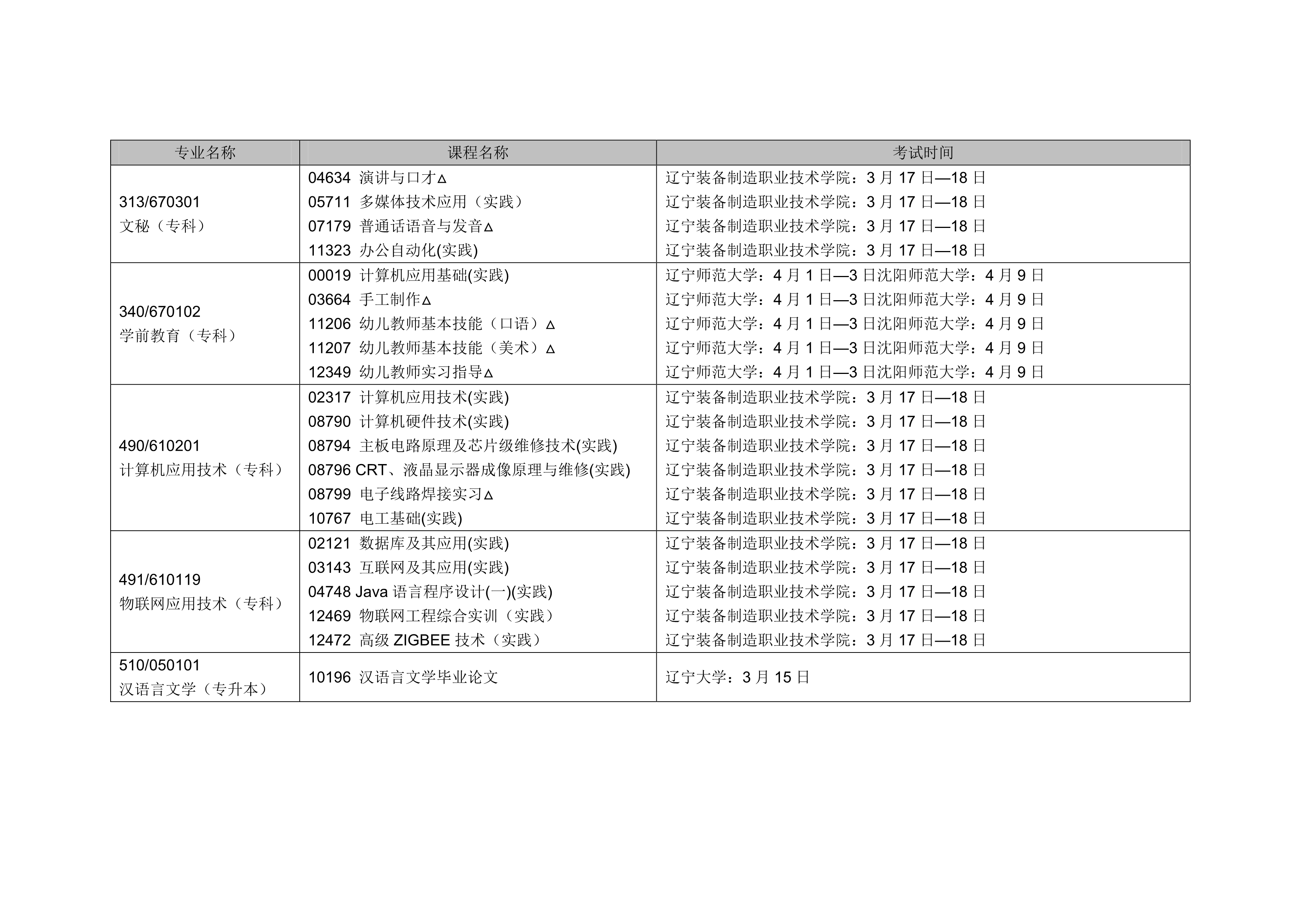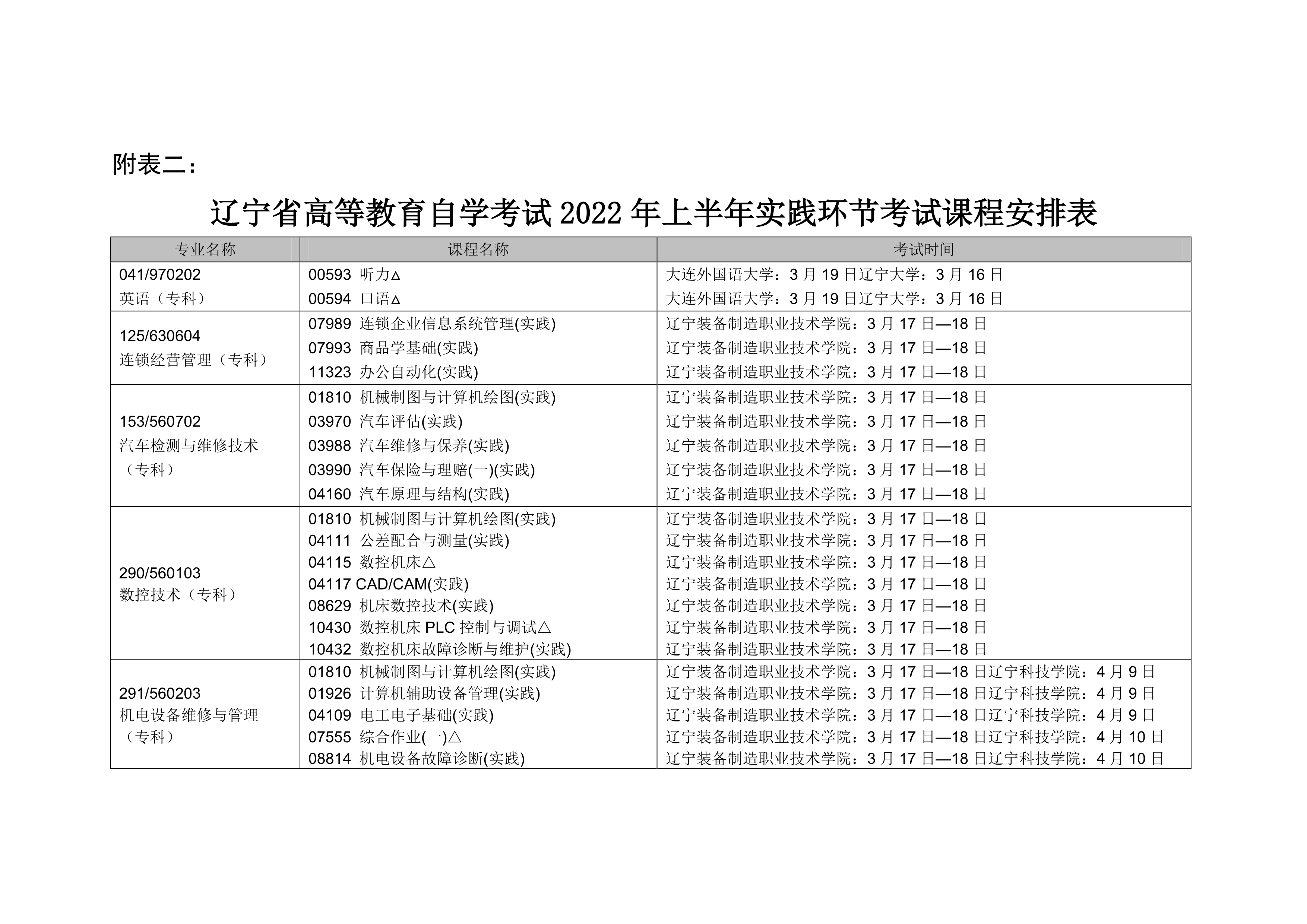 2022年上半年遼寧自考實踐環(huán)節(jié)考試課程安排表