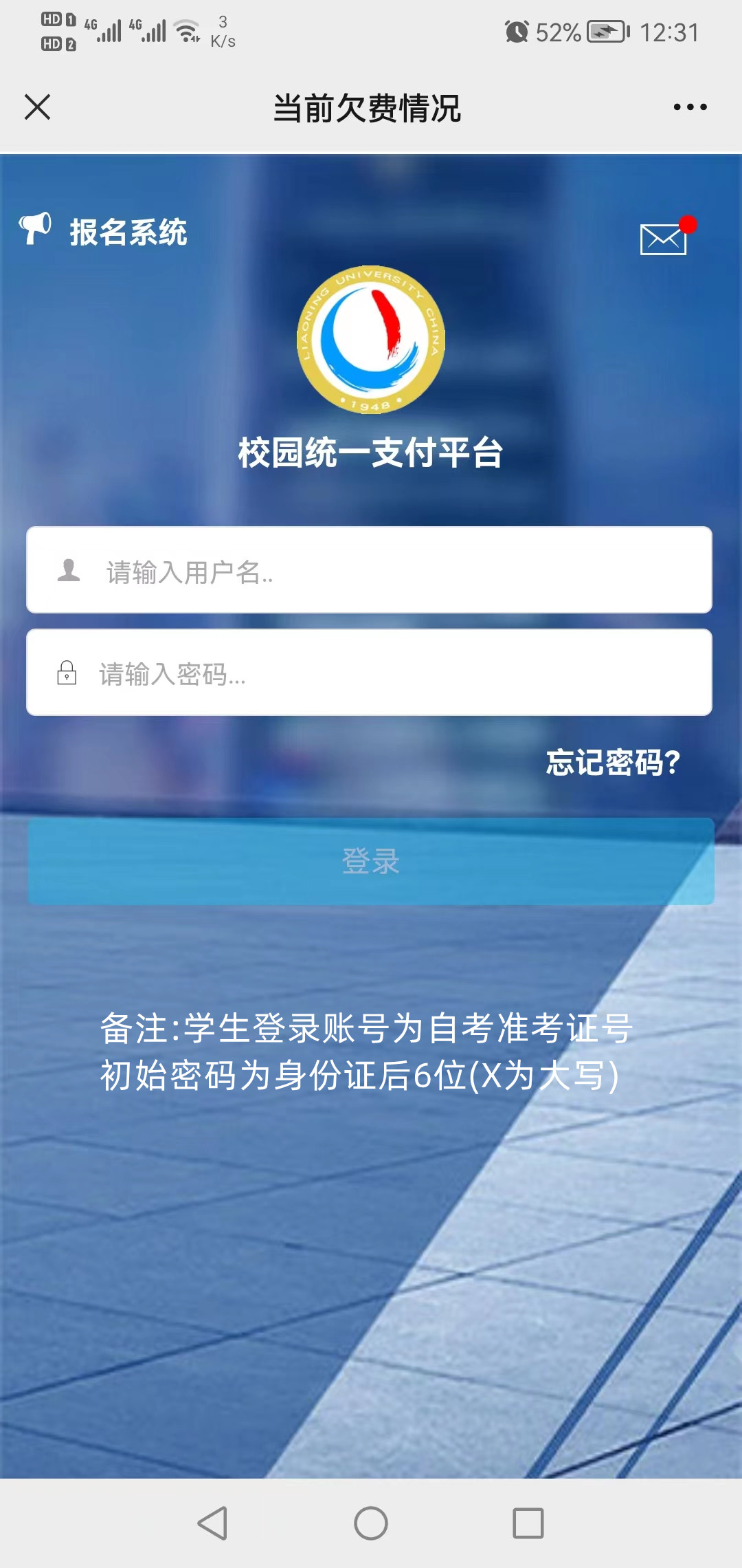 2.進入校園統(tǒng)一支付平臺登錄頁面后,登錄賬號為自考準考證號,初始密碼默認為身份證號后6位,身份證尾號為X的輸入大寫X,點擊登錄。