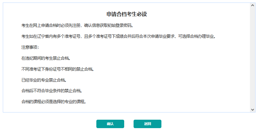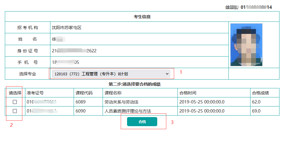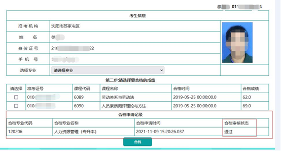 4.選擇要申請畢業(yè)的專業(yè),然后選擇考生其他準考證號下的成績,點擊合檔按鈕提交合檔申請。