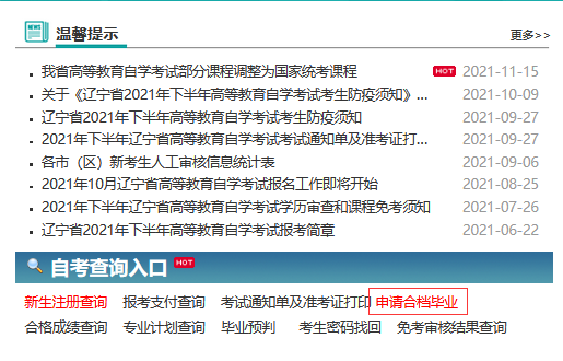 1.考生通過瀏覽器訪問遼寧省高等教育自學(xué)考試網(wǎng)上服務(wù)平臺后,點擊自考查詢?nèi)肟谥械摹吧暾埡蠙n畢業(yè)”鏈接進行申請。