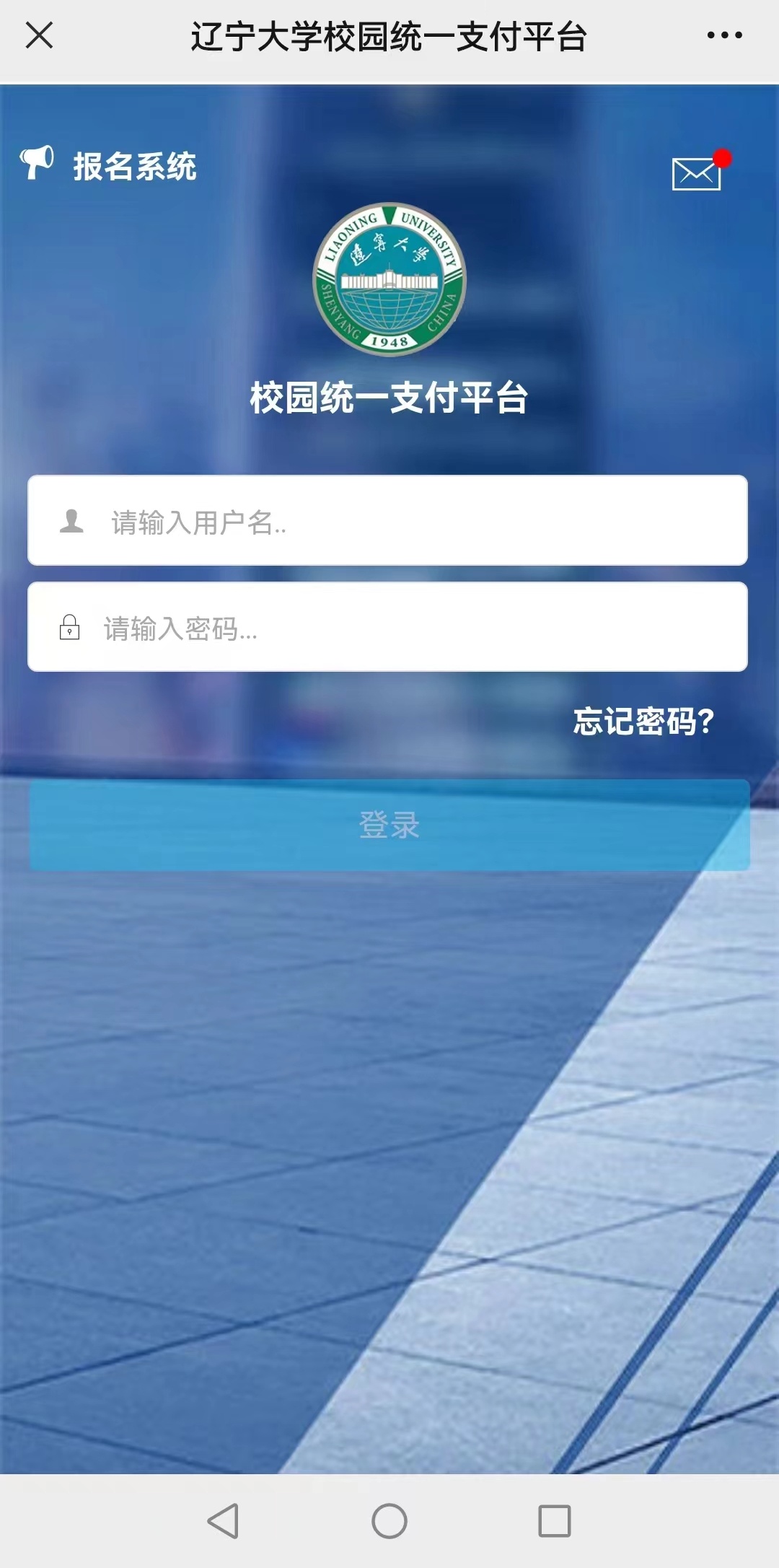 1.登錄微信,微信中搜索并關(guān)注“遼寧大學(xué)計(jì)劃財(cái)務(wù)處”微信公眾號(hào),通過下方“查詢繳費(fèi)”,選擇“學(xué)宿費(fèi)繳費(fèi)”進(jìn)入“校園統(tǒng)一支付平臺(tái)”登錄界面。也可登錄網(wǎng)址http://xysf.lnu.edu.cn/xysf/直接進(jìn)入“校園統(tǒng)一支付平臺(tái)”登錄界面。
