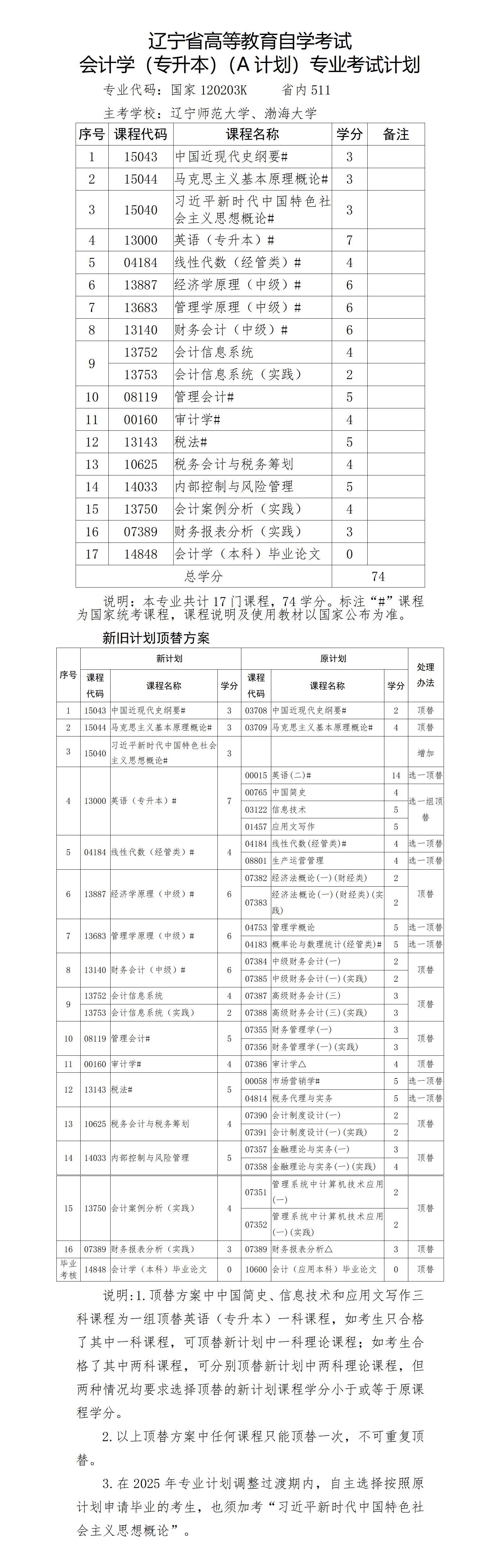 2025年4月遼寧自考本科會(huì)計(jì)學(xué)(A計(jì)劃)專(zhuān)業(yè)計(jì)劃