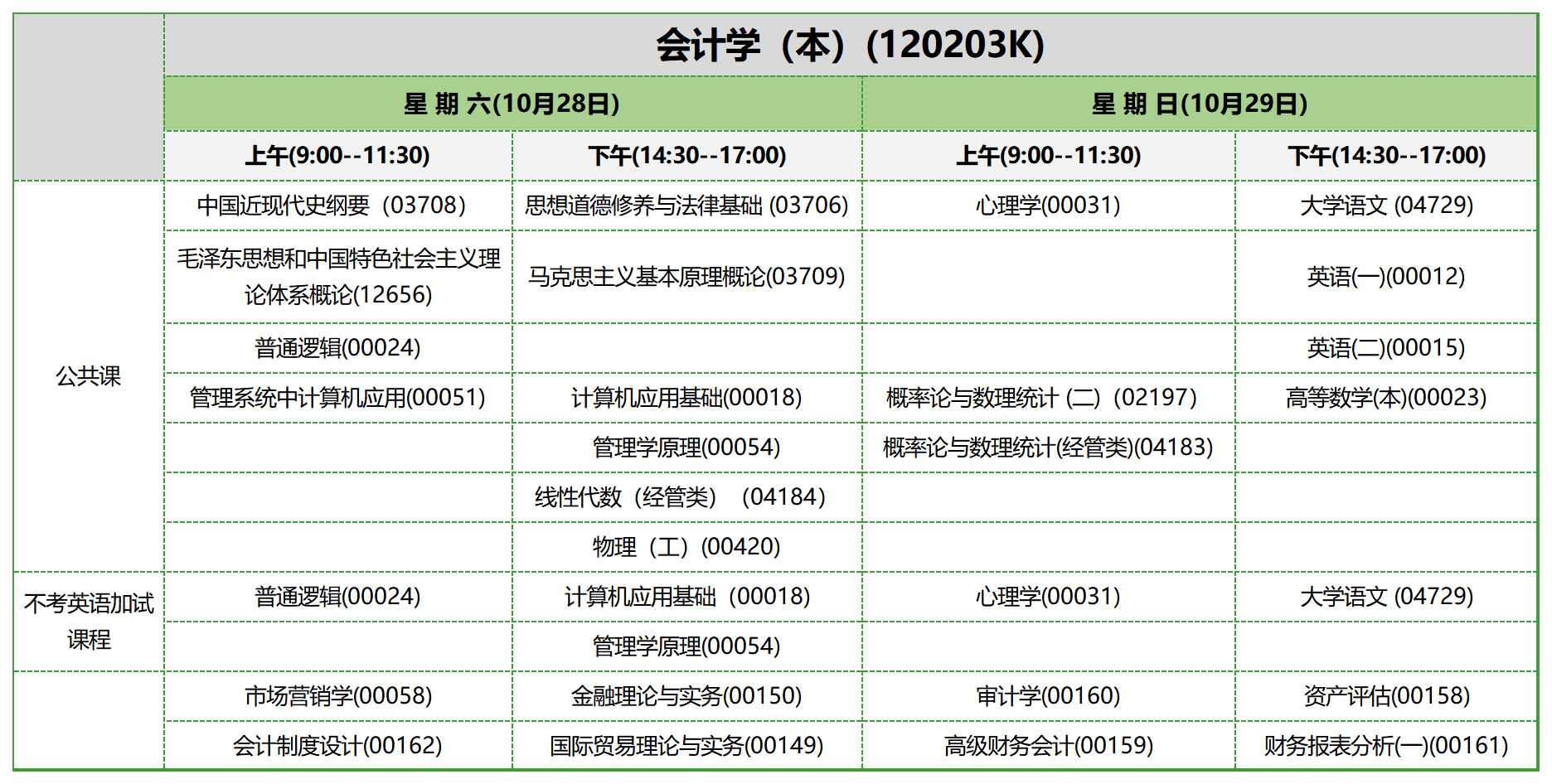 10月考期內(nèi)蒙古自考公共課考試安排+會(huì)計(jì)學(xué)本科安排如下: