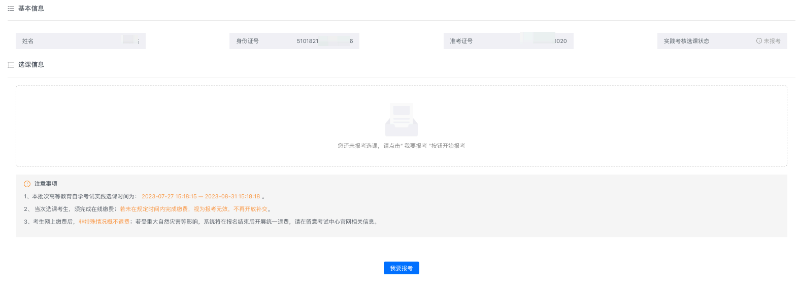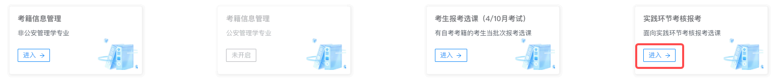 進入自學考試網上報名系統(tǒng)(點擊咨詢網站入口>>),點擊下方“實踐環(huán)節(jié)考核報考”,進入實踐環(huán)節(jié)考核課程報名。