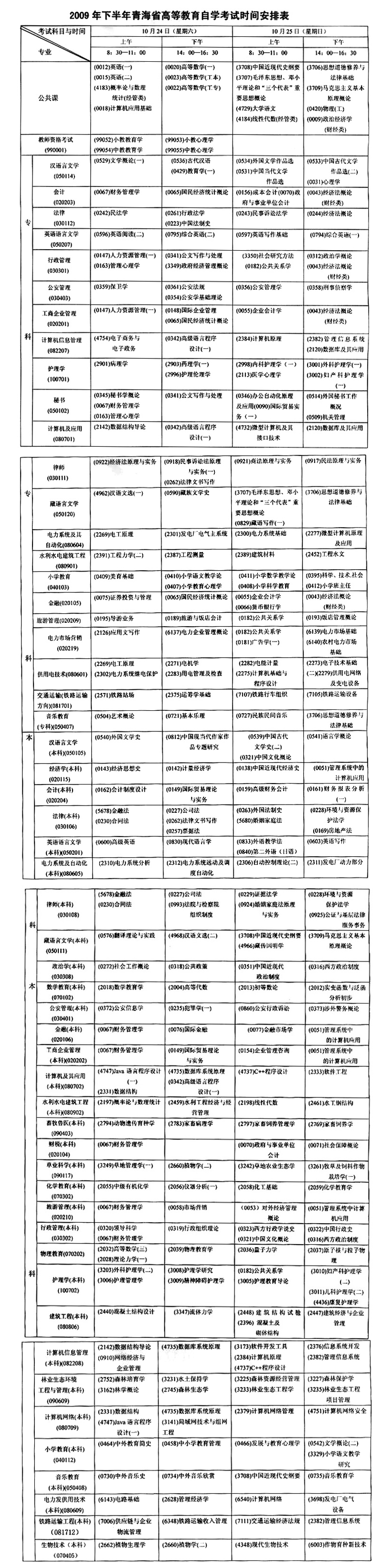 青海09年下半年自學考試時間安排表