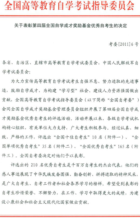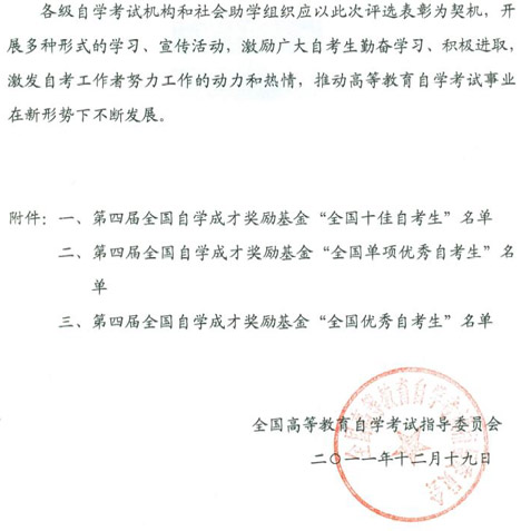 附件一:第四屆全國自學成才獎勵基金“全國十佳自考生”名單