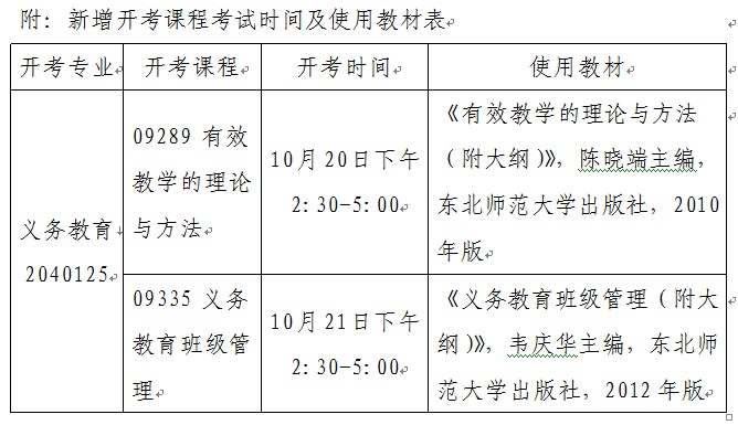根據(jù)全國考辦《2012年全國高等教育自學考試統(tǒng)考課程時間安排表》,我省高等教育自學考試義務(wù)教育(本科段)專業(yè)在2012年10月的考試中新增開考“有效教學的理論與方法”和“義務(wù)教育班級管理”兩門課程,詳見附表。