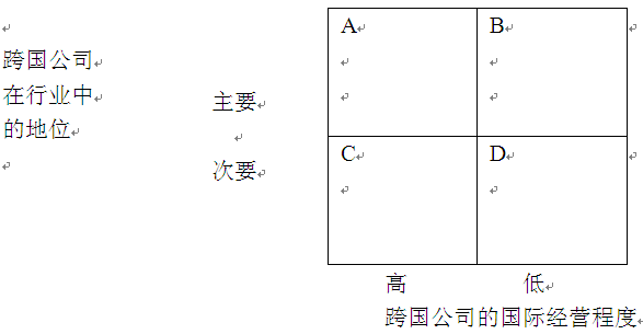 20.根據(jù)跨國公司在行業(yè)中所具有的地位以及跨國公司的跨國經(jīng)營程度可將世界上的行業(yè)分為四類:全球性行業(yè)、多國性行業(yè)、大宗貿(mào)易市場和純國內(nèi)行業(yè)。下圖中的B象限是( B )