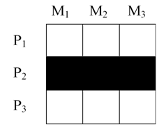 13.圖中M表示市場,M1、M2、M3分別表示不同的細(xì)分市場;P表示產(chǎn)品,P1、P2、P3分別表示不同類型的產(chǎn)品;黑色方格表示企業(yè)的目標(biāo)市場選擇。請根據(jù)示意圖判斷屬于哪一種目標(biāo)市場選擇模式?( D )
