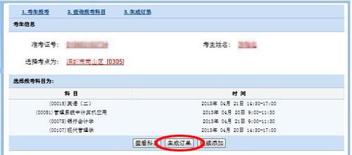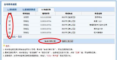 8、在“生成訂單”中選擇要付費(fèi)的考生科目,生成付費(fèi)訂單。