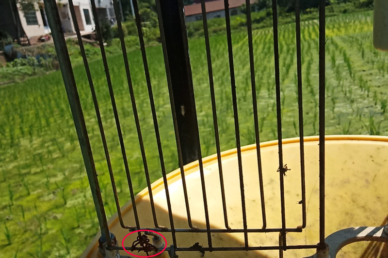 上圖:太陽能殺蟲燈高壓電網有斷裂(紅色標記處)