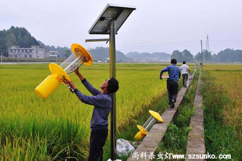 三、水稻田布局太陽能殺蟲燈:在水稻地區,殺蟲燈要盡量安裝在田旁草地、旱作地、大路邊和水溝邊,以減少漏網害蟲對燈下水稻的集中危害。燈得間距確定以后,依照相同的距離將燈排列成行,相鄰兩行的燈位相互相以構成三角形為好。
