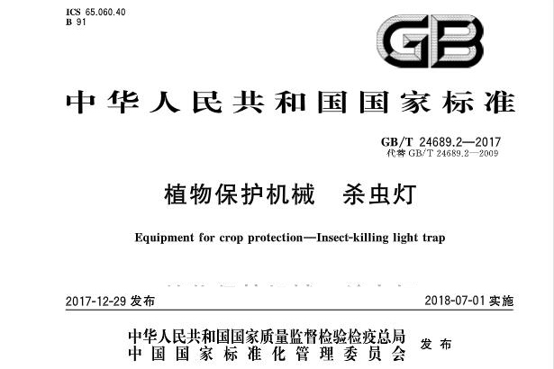 太陽能殺蟲燈國家標準先后經歷過兩個版本。目前處于生效中的是GB/T 24689.2-2017,中文名稱是《植物保護機械 殺蟲燈》,英文名稱是《Equipment for crop protection—Insect-killing light trap》。之前提到的GB/T24689.2-2009已經停止使用。