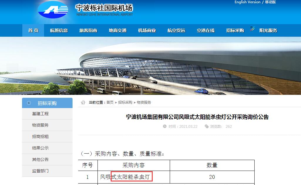 為了解決機(jī)場(chǎng)周邊蚊蟲問題,寧波櫟社國(guó)際機(jī)場(chǎng)就曾多次集中采購(gòu)殺蟲燈進(jìn)行使用。從招標(biāo)公告中查到,寧波櫟社國(guó)際機(jī)場(chǎng)采購(gòu)的就是太陽(yáng)能殺蟲燈。相比交流電殺蟲燈,太陽(yáng)能殺蟲燈依靠太陽(yáng)能供電系統(tǒng),更加環(huán)保,節(jié)約能源。而且太陽(yáng)能殺蟲燈安裝時(shí)無需接電,也就省去了布線的大量工程,更加便捷。智能化的光控、雨控、時(shí)控設(shè)置,也是太陽(yáng)能殺蟲燈的加分項(xiàng)。