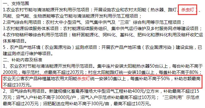 各省份對購買使用殺蟲燈的財政補貼政策不一樣,有的地方補貼多,有的地方補貼少。比如在浙江省,這個沿海地區,農業無公害農產品種植基地農用太陽能殺蟲燈統一安裝10盞以上,每盞補助不高于50%,補助總額最高不超過10萬元。