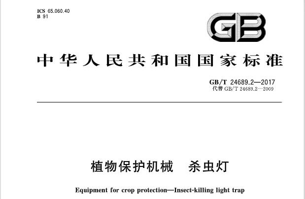 頻振式殺蟲燈國家標準:現行頻振式殺蟲燈國家標準是GB/T24689.2-2017《植物保護機械頻振式殺蟲燈》,之前使用的GB/T24689.2-2009已經廢止,不再使用。