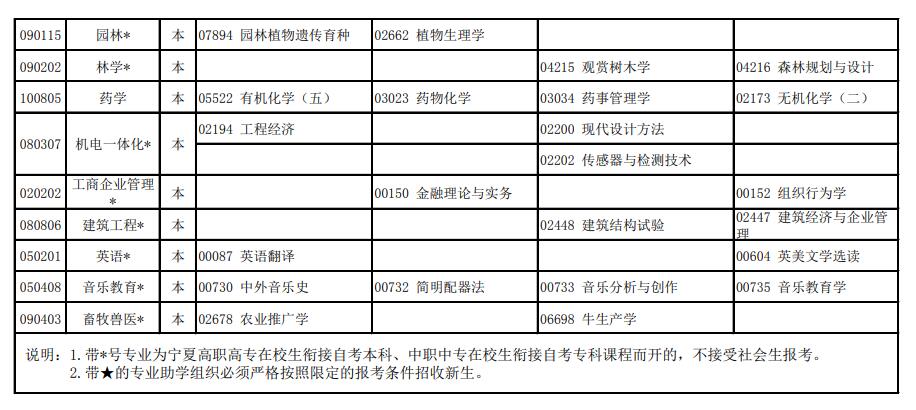 1.帶*號(hào)專(zhuān)業(yè)為寧夏高職高專(zhuān)在校生銜接自考本科、中職中專(zhuān)在校生銜接自考專(zhuān)科課程而開(kāi)的,不接受社會(huì)生報(bào)考。