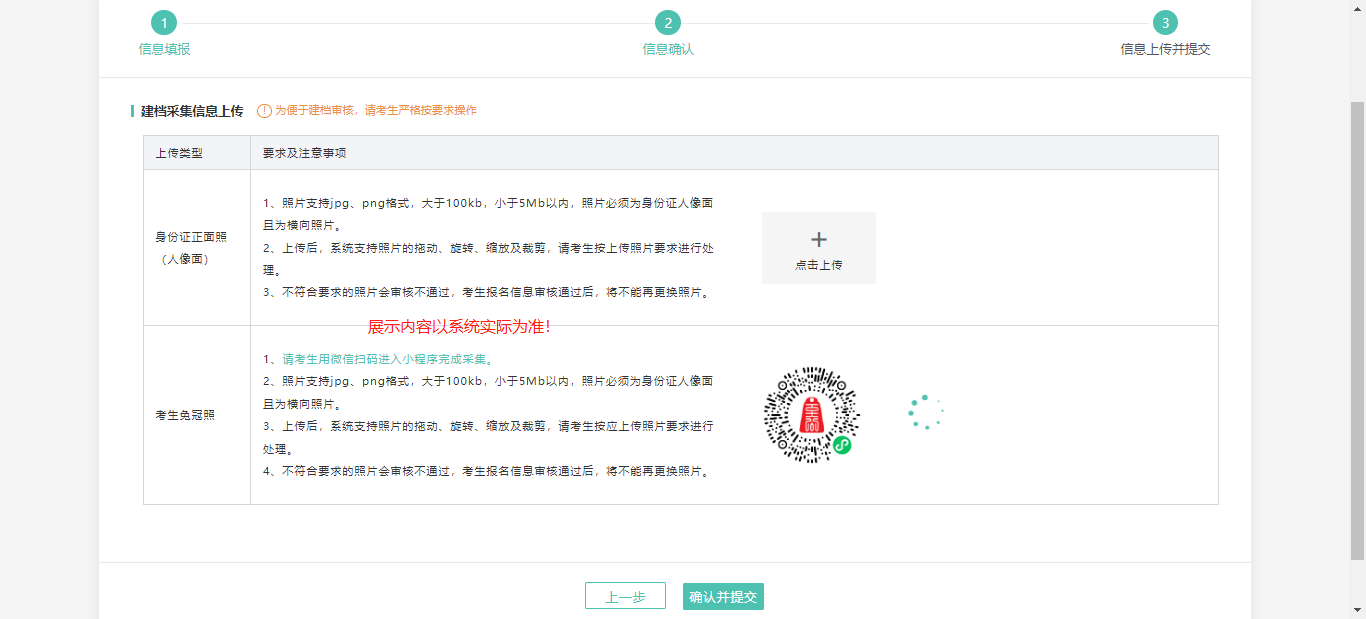 信息上傳并提交進(jìn)入信息上傳并提交頁面后,考生請(qǐng)按要求,上傳身份證正面照片、使用微信掃碼進(jìn)入小程序完成免冠照片采集。