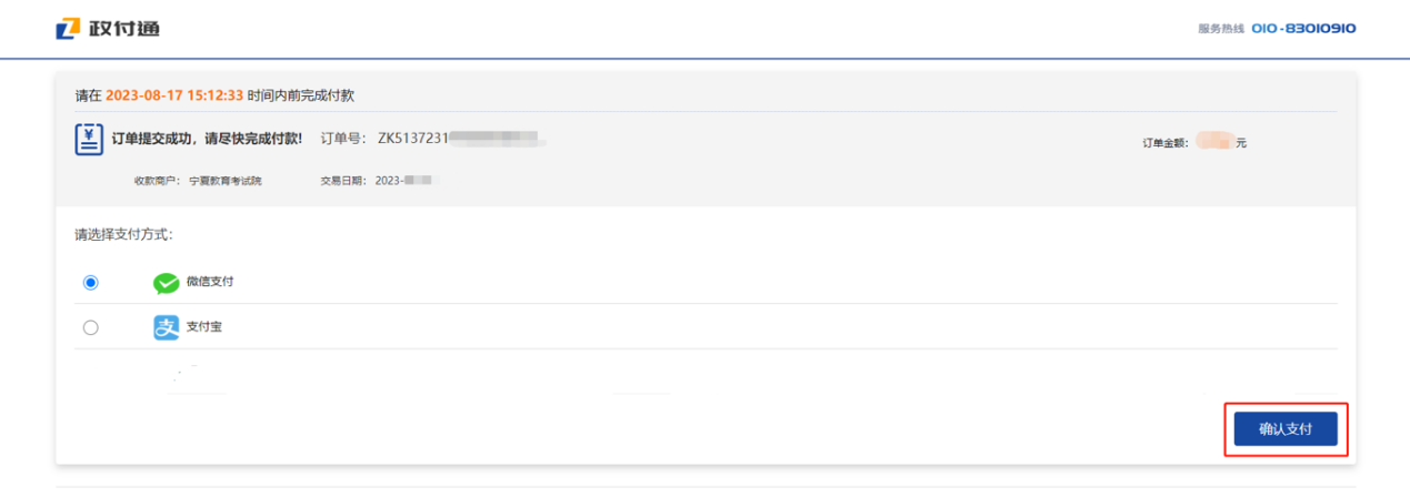 點(diǎn)擊“確認(rèn)”后,將跳轉(zhuǎn)支付平臺(tái),考生請(qǐng)根據(jù)個(gè)人情況選擇對(duì)應(yīng)的支付方式并點(diǎn)擊“確認(rèn)支付”。