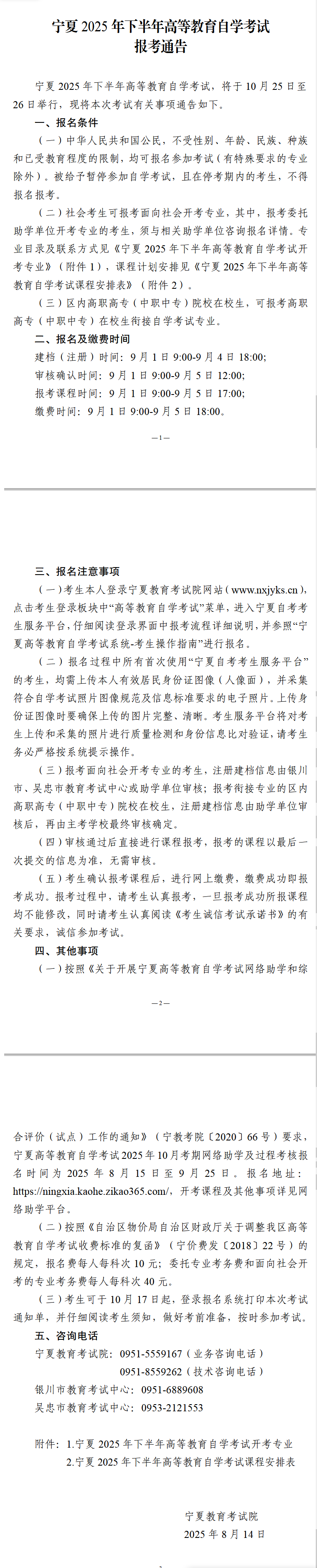 寧夏 2025 年下半年高等教育自學(xué)考試 報考通告