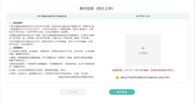 請考生根據(jù)頁面左側(cè)的“照片圖像采集規(guī)范及信息標(biāo)準”要求上傳本人符合要求的電子照片,在上傳過程中盡量使人臉部居于相框中間,上下左右預(yù)留距離,同時臉部占整張圖片的比例不能太大。電子照片上傳后,點擊“提交驗證”按鈕,系統(tǒng)將自動進行身份信息驗證。在照片上傳過程中,如三次上傳不成功系統(tǒng)將會提示您選擇繼續(xù)進行上傳還是到考區(qū)線下采集信息,考生可根據(jù)自己實際情況進行選擇。