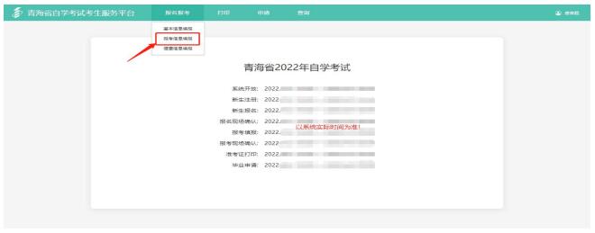 進入青海省自學(xué)考試考生服務(wù)平臺,找到頁面上方“報名報考”并在彈出的菜單中選擇“基本信息填報”。