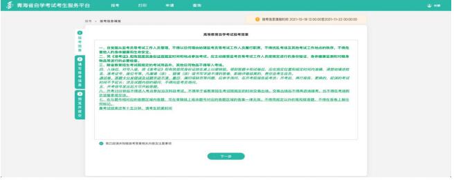 在彈出的高等教育自學(xué)考試報考簡章頁面中勾選“我已閱讀并知曉報考簡章相關(guān)內(nèi)容及注意事項”并點擊“下一步”。