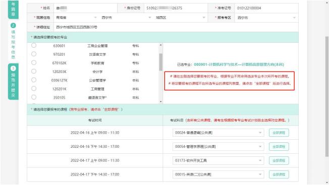 【填寫報考信息】根據(jù)頁面提示,選擇報考的考區(qū)、專業(yè)及課程信息,“報考考區(qū)”即實際考試地點。