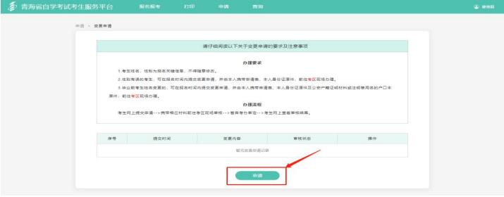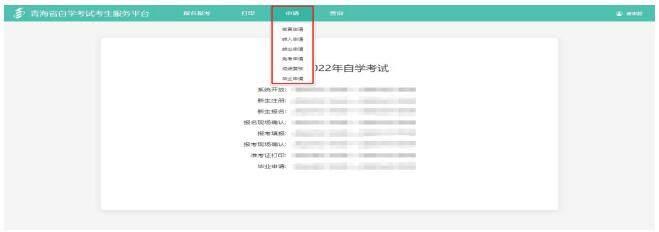 (1)進入青海省自學(xué)考試考生服務(wù)平臺,找到頁面上方“申請”并在彈出的菜單中選擇“變更申請”;