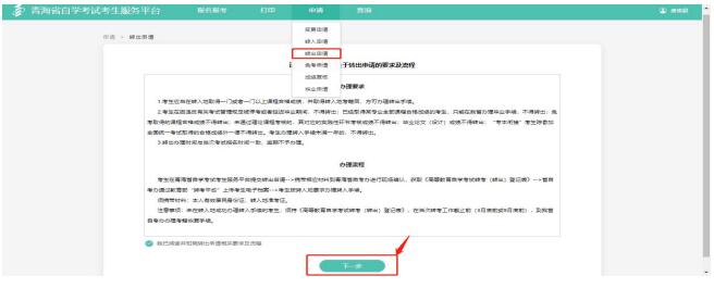 (2)在彈出的轉(zhuǎn)入申請頁面中勾選“我已閱讀并知曉轉(zhuǎn)入相關(guān)要求及流程”,點擊“下一步”(如需打印準考證用作證明,可點擊準考證打印);
