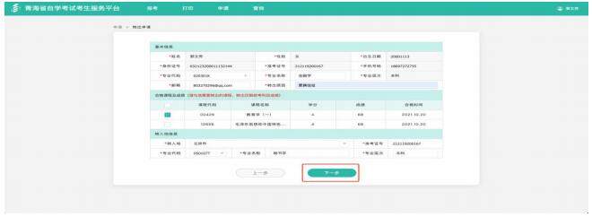 (4)根據(jù)系統(tǒng)提示,依次填寫免考申請信息,點擊“下一步”;