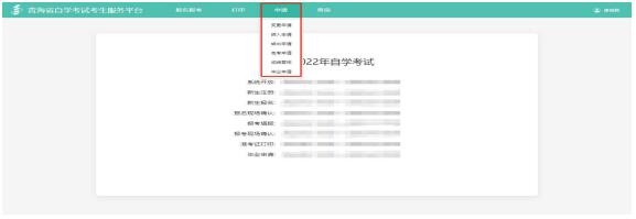 (1)進(jìn)入青海省自學(xué)考試考生服務(wù)平臺,在上方導(dǎo)航欄中點擊“申請”,在下拉菜單欄中選擇“成績復(fù)核”;