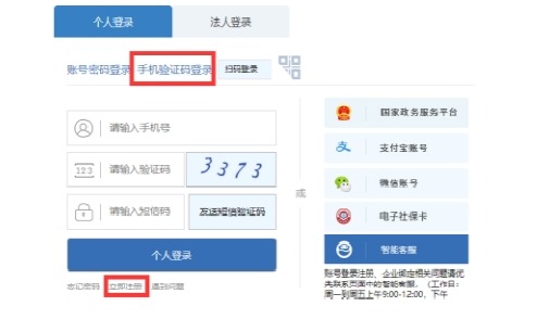 (三)點擊“進(jìn)入辦理”后,進(jìn)入下圖所示的“個人登錄”頁面。如果從未使用過山東省政務(wù)網(wǎng),登錄前需要先完成個人注冊,點擊左下角的“立即注冊”,進(jìn)入“賬號注冊”頁面。