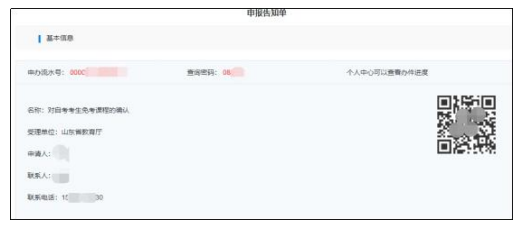 6.完成材料上傳后,點擊“提交”按鈕提交最終的免考申請,至出現(xiàn)“申報告知單”頁面后(如下圖),辦理完成。