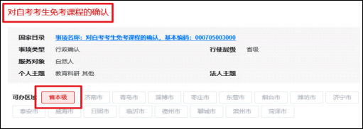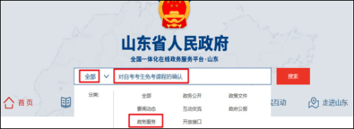 (二)在網站首頁的搜索框左側點擊“全部”,從“分類”中選擇“政務服務”,在文本框中輸入“對自考考生免考課程的確認”,點擊“搜索”后,從搜索結果中找到如下頁面。