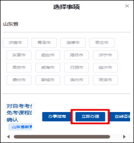 (三)點擊紅色標題“對自考考生免考課程的確認”,在彈出的“選擇事項”頁面中,點擊紅色框內的“立即辦理”。