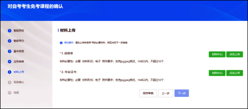 5.點擊“下一步”按鈕,進入材料上傳頁面(如下圖),請點擊綠色的“點擊上傳”按鈕,按照要求上傳對應的材料圖片,圖片支持JPG、JPEG格式,圖片清晰、文件大小須在1MB以內。