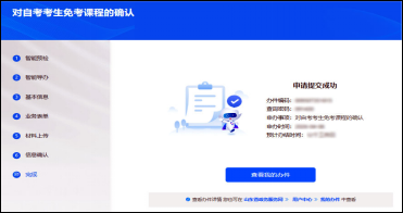 6.完成材料上傳后,點擊“下一步”按鈕進入信息確認頁面,考生檢查確認后提交最終的免考申請,出現“申請提交成功”頁面后(如下圖),辦理完成。