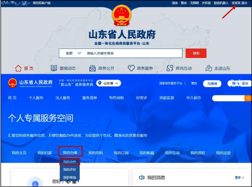“對自考考生免考課程的確認”審核完成后,我省會將審核結果回登至該網站,考生可登錄“山東省政務網”,點擊右上角“姓名”進入“個人專屬服務空間”界面(如下圖),在“我的辦事”中“我的辦件”頁面查找“對自考考生免考課程的確認”,查看辦件狀態,點擊“操作—查看”可查看詳細的辦理情況,同時也會收到審核結果告知短信。