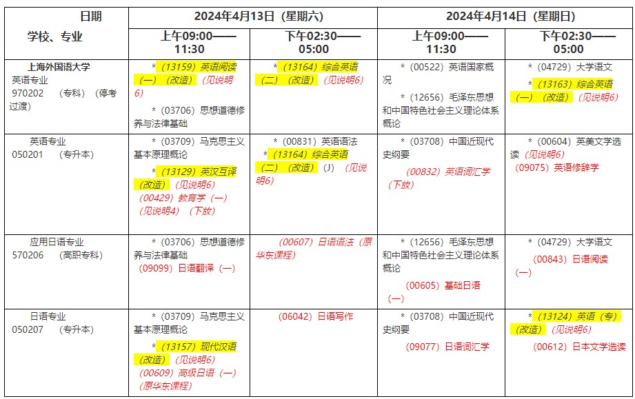 2024年4月上海外國語大學(xué)自考各專業(yè)課程考試日程安排表