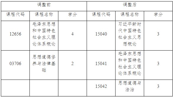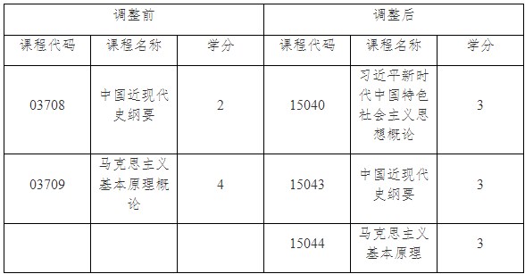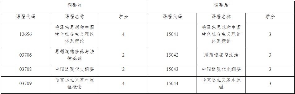 一、調(diào)整后高等教育自學(xué)考試本專科層次專業(yè)的思想政治理論課均設(shè)置3門課程,共9學(xué)分,調(diào)整前后的變化如表所示。