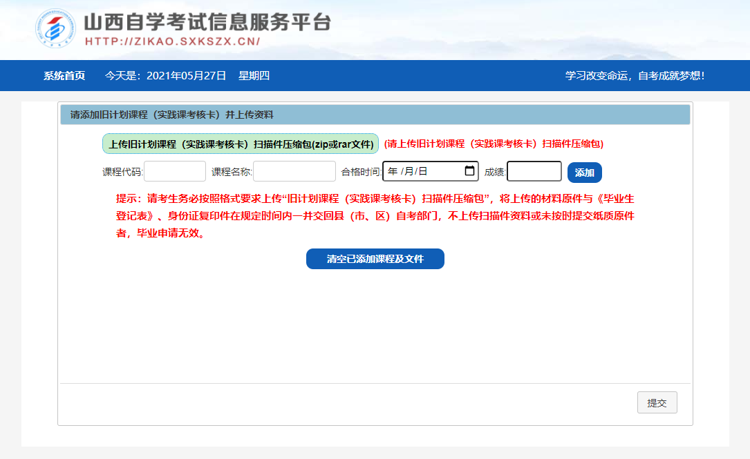 提示:請(qǐng)考生務(wù)必按照格式要求上傳“舊計(jì)劃課程(實(shí)踐課考核卡)掃描件壓縮包”,將上傳的材料原件與《畢業(yè)生登記表》、身份證復(fù)印件在規(guī)定時(shí)間內(nèi)一并交回縣(市、區(qū))自考部門(mén),不上傳掃描件資料或未按時(shí)提交紙質(zhì)原件者,畢業(yè)申請(qǐng)無(wú)效。