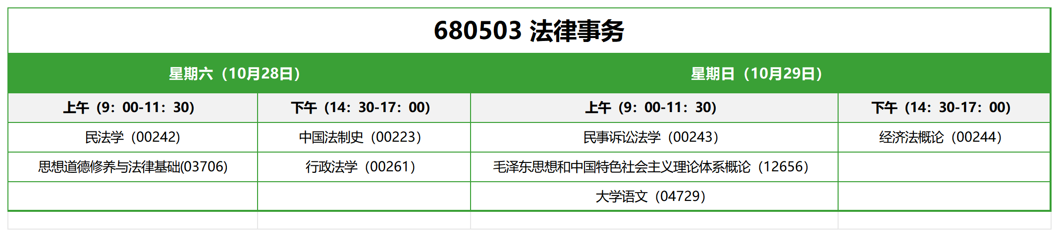 想要備考2023年10月的山西自考的學(xué)員們,如果您選擇法律事務(wù)專(zhuān)科,請(qǐng)注意報(bào)考時(shí)選擇專(zhuān)業(yè)代碼為680503。考試安排在10月28日-29日,上午和下午各有一科,分別為9:00-11:30和14:30-17:00,共計(jì)可以考試4科。