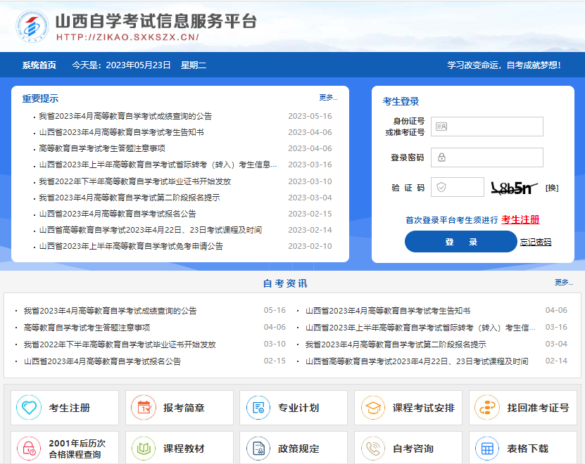 二、進入“山西自學考試信息服務平臺”,考生可以通過“身份證號或準考證號”+“密碼”登錄系統(tǒng)。首次報考的新生需要先進行考生注冊,未獲得登錄密碼的在籍考生也需要進行考生注冊。