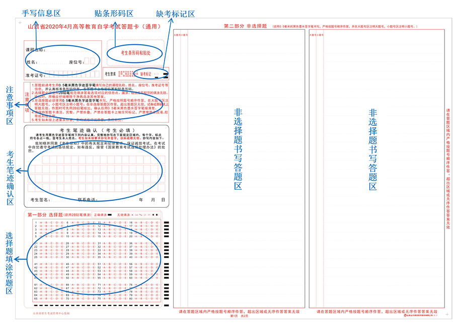 答題卡卡面包括手寫信息區(qū);貼條形碼區(qū);缺考標(biāo)記區(qū);注意事項(xiàng)區(qū);考生筆跡確認(rèn)區(qū);選擇題填涂答題區(qū);非選擇題書寫答題區(qū)等部分。樣卡如下: