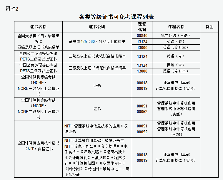 第九條 獲得國家承認(rèn)的有關(guān)等級證書持有者報(bào)考高等教育自學(xué)考試可免考專業(yè)考試計(jì)劃規(guī)定的課程,具體詳見附件2。