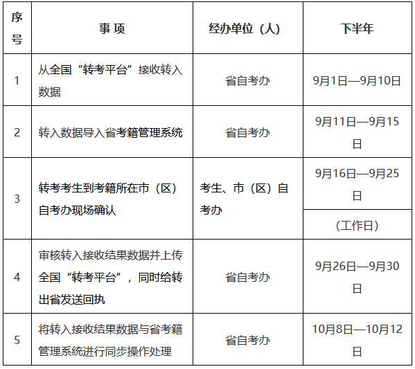 1.轉(zhuǎn)入考生應(yīng)及時(shí)關(guān)注轉(zhuǎn)出省考生服務(wù)平臺(tái)本人轉(zhuǎn)考信息,轉(zhuǎn)出成功后,在規(guī)定日期內(nèi),到我省考籍所在市(區(qū))自考辦辦理轉(zhuǎn)入確認(rèn)手續(xù)。
