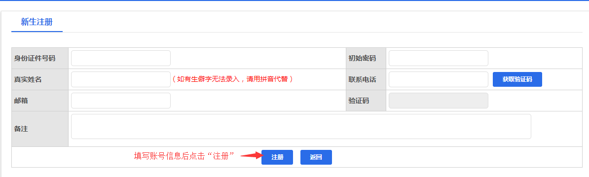 第一步:系統(tǒng)賬號(hào)注冊(cè)(已注冊(cè)或老考生請(qǐng)直接查看第二步),考生在本系統(tǒng)注冊(cè)賬號(hào),用于登錄本系統(tǒng)。