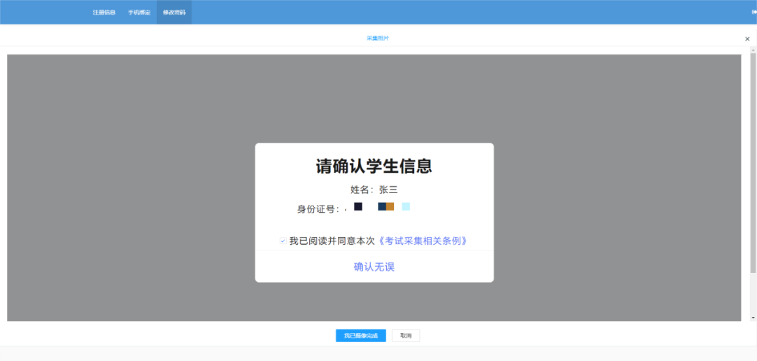 2.采集過(guò)程中,提示服務(wù)器繁忙,請(qǐng)考生刷新注冊(cè)界面,重新掃碼采集,持續(xù)出現(xiàn)問(wèn)題則稍后再試或聯(lián)系技術(shù)支持。